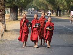 ミャンマーでは、男子は一生に一度は出家得度して修行するのが不文律となっていることから、ミャンマー独特のくすんだ朱色の衣をまとった姿を、街や村の至る所で見かける。 |